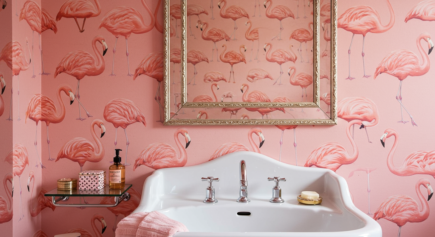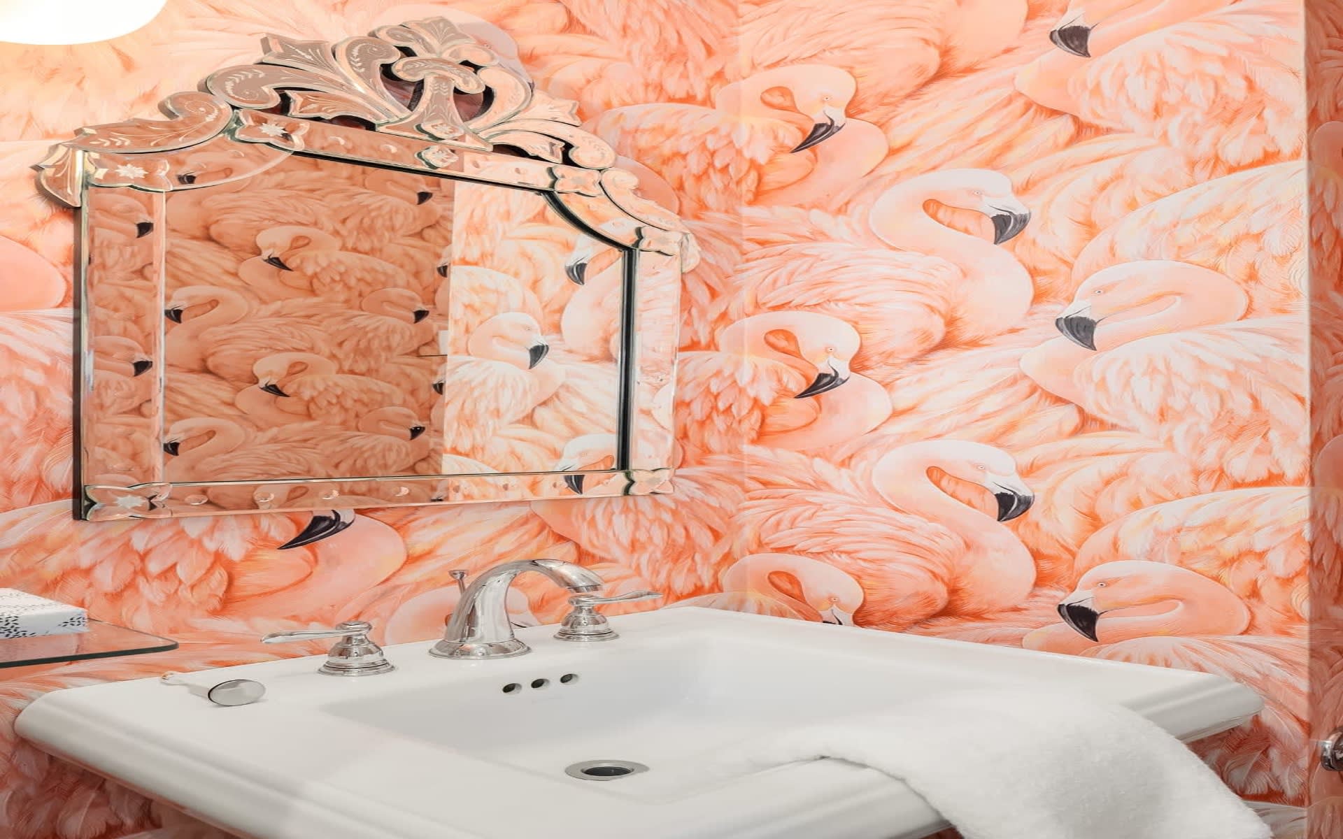 Dazzle guests and add a pop of color to your bathroom with some funky wallpaper! It's not often you find pink flamingoes in your bathroom.